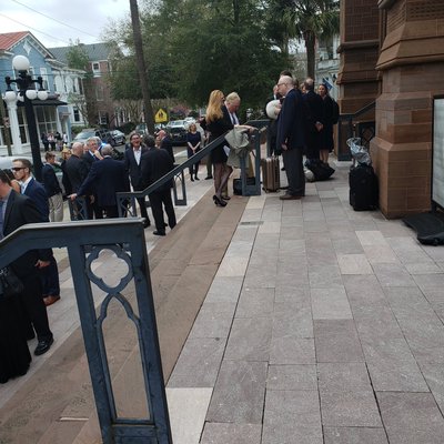 : After funeral mass for PAT CADDELL in Charleston, SC Doug Schoen and Ann Coulter are talking.